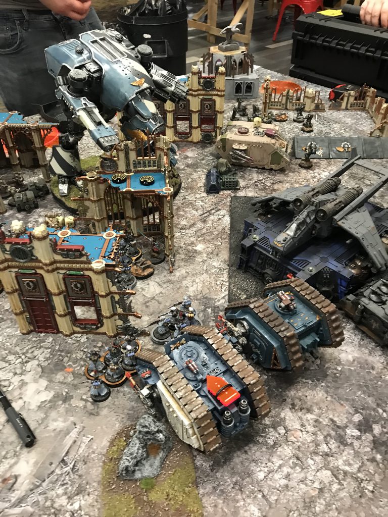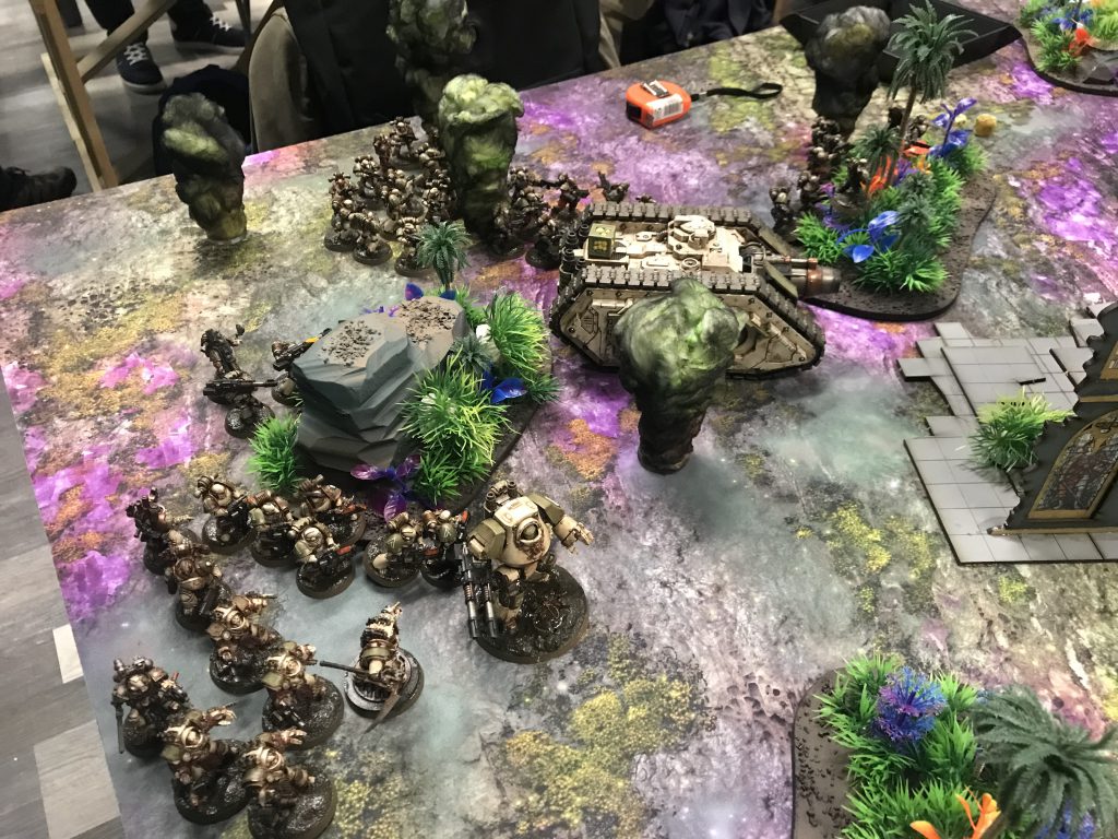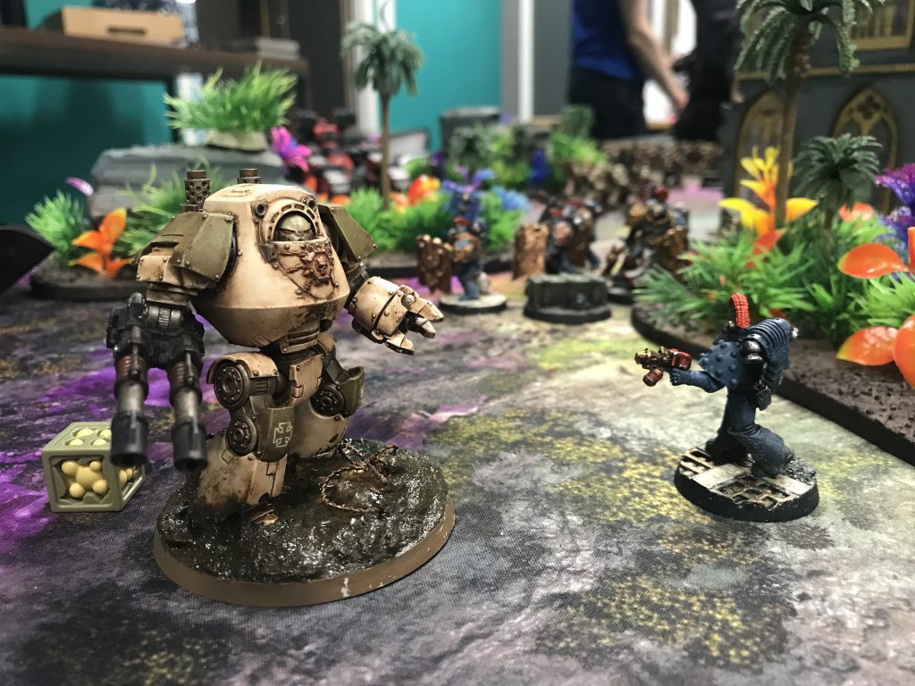 One of many unique bits of the day was that we’d also been asked to bring reinforcements along, a 750 point list that you could throw in to other battles to bolster your side. This proved to be very interesting - see my game three below - but a lot of fun was had with it. Immediately after my first game I was thrown into another, with my brave Militia deploying into a Raven Guard vs Death Guard and Warhound Titan game. 21 militia in Bs3 raiders was a bit of a joke in the run up to the game, but they deployed, held an objective, racked up points and helped the Raven guard to a significant victory.