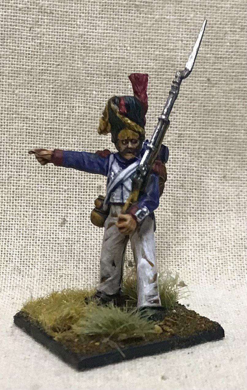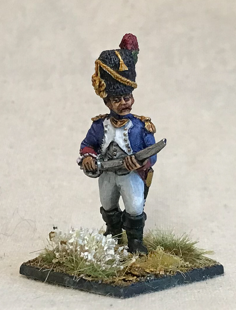 I am finally at a point where I can put together a real, full force for at least one game system. The recommended base force for Sharp Practice (French Regulars 1813), is five groups of eight line, six skirmishers and three leaders. Sharp Practice characters can be up to four tiers of leader (with IV being the top tier), and at the scale the game plays at represent everything from NCOs to Captains - or even a Colonel or Chef de Battalion leading an audacious action. It's definitely time I had some leaders, so making one for each tier gives me some characters, background to get researching/writing and a chance to paint a little differently.
