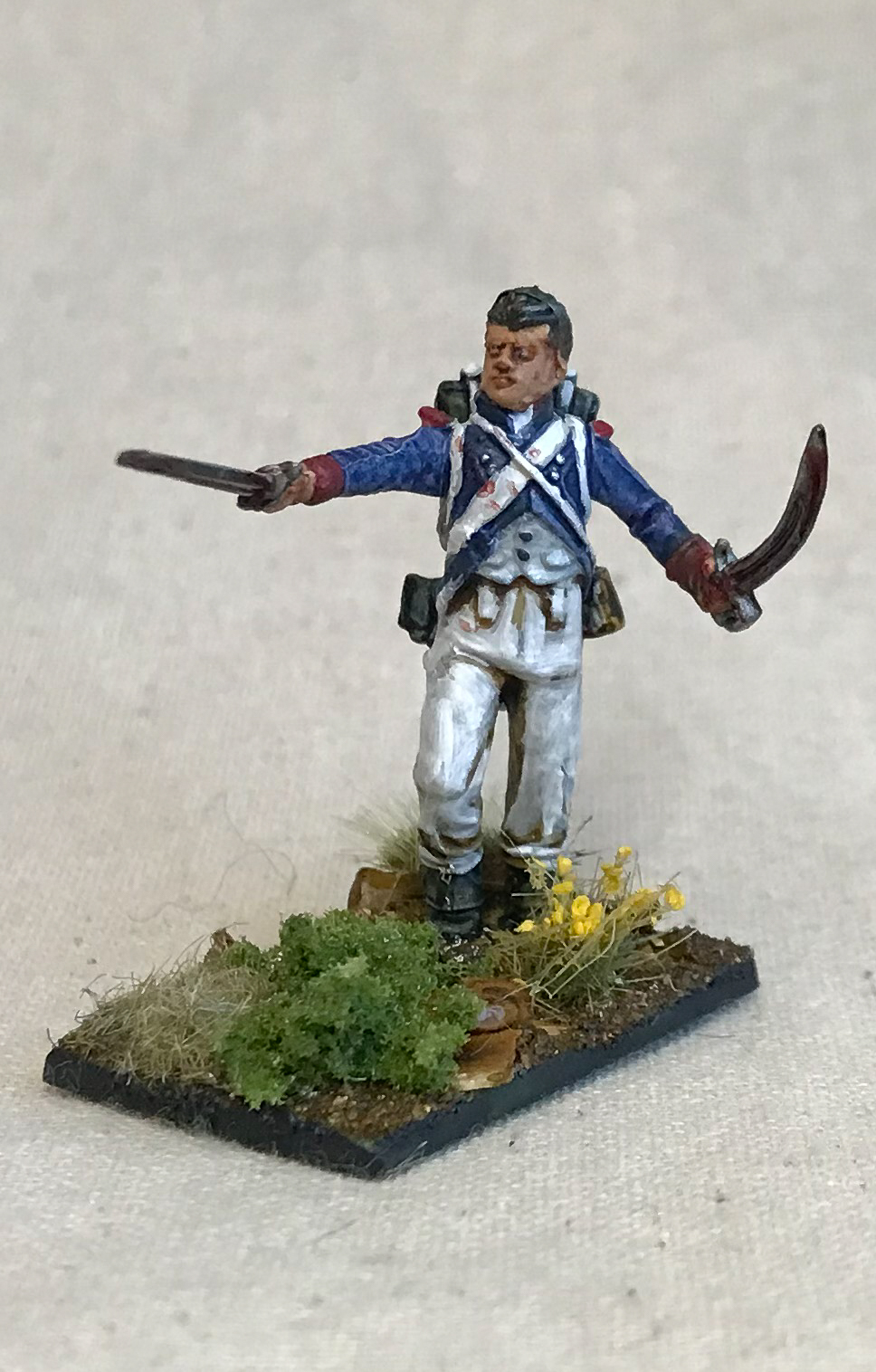 I'll be using these guys as the light troops they theoretically were. I sorely need a skirmishing unit to use - on individual bases - in Sharp Practice and smaller scale games, and with their sharp green and yellow piped uniforms providing some variety amongst the blue and white, these are perfect for the growing army. These models are the Wargames Foundry Flanquers-Chasseurs and they are small, chunky lads, very different to the Perry and Victrix metals and plastics I've been working with. Getting them felt very much like a proper foray into your dad's Napoleonics - solid chunks of characterful white metal at 22-25mm scale. Nice models, but painting chunkier, old-style metals is something I haven't done in a while, and it shows!