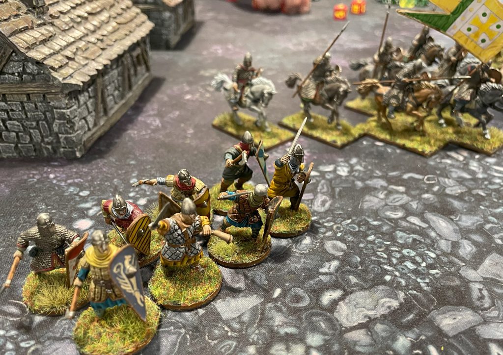 A really fantastic day all round - thanks Jim, Laura and Bair! I've learnt a lot - I need more practice with the Saracens, clearly, because I didn't even really come close to a victory in all three games. I'll carry on practicing with them, and I'll even finish off the last unpainted models I need for a 28 cavalry list. The main takeaway though was that playing against the Anglo-Danes made me want to play with them, with a very different style to the mobile Saracens. I more or less have that army already - the Normans - and switching would mean I could paint 8 warriors with big axes, rather than 16 Norman Cavalry.I immediately picked up some Footsore Huscarls and dug out some spare Victrix Anglo Danes and - once they're painted - I'll have a big slab of Anglo Danes with a banner and priest, aiming to leave my troops as fresh as a daisy throughout the game while they crush exhausted, staggering opponents. As I'm using mainly Norman models, I'm going to scatter in some round shields and more axes but keep the Norman kit. I'm not sure if this makes the army more or less accurate to the "real" look of the Anglo-Danes, but it'll definitely make them look like the defenders at Hastings according to the Bayeux Tapestry, so that's all to the good (see the banner for three painted examples!).