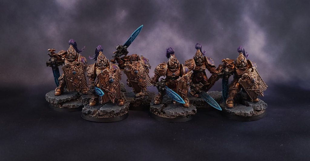 With “only” move 7 and the Heavy unit type, Aquilons aren’t going to get anywhere all that fast and that’s a bit of a problem for the unit. Their selling point is that they’re tough, with a 2+/4++ and 3W. They all come with Solarite gauntlets (excellent S10 AP1 unwieldy attacks) though each one only gets 3A, unusually. Of course that number goes up if they charge or meet an enemy Nemesis unit.They’re pretty shooty. Their base Lastrum Storm Bolter has 3 S5 AP4 shots with shred and that can be upgraded to either a firepike (S6 and Torrent 9”) or twin-linked adrathic destructor, which has one S5 AP3 instant death armourbane shot. I think the firepikes are my favourite of these, partly as they don’t limit what you charge all that much, thanks to torrent.