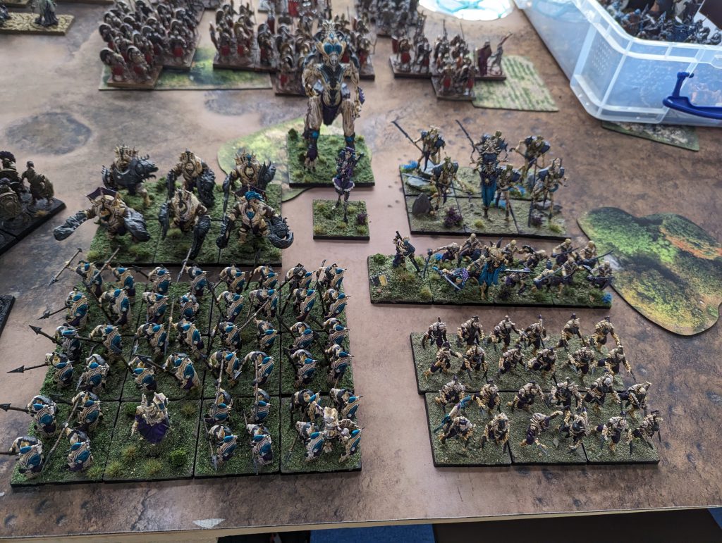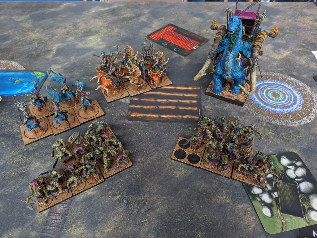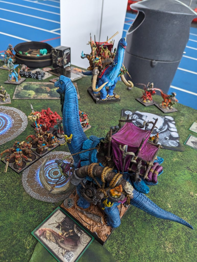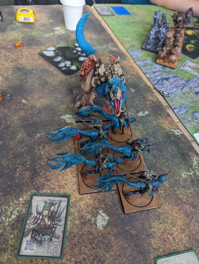 I played W'adrhŭn for the event, with the aim to include as many of the new awesome dinosaurs as I could reasonably fit (and paint) in a 2000 point list. With some practice games in the months building up, I decided on the below list: I consciously chose a low activation list, wanting to take the advantage to Supremacy rolls as much as I could. Combined with the W'adrhŭn speed, I wanted to take the initiative with charges and damage whilst having big enough units that I wouldn’t be reduced below effective strength on the way in.