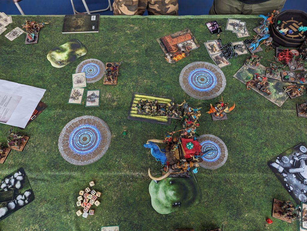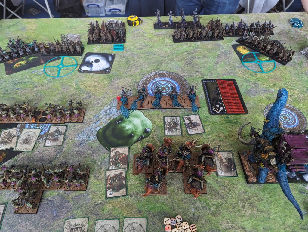 This is what in Total War they call a "Pyrrhic Victory"This game turned on two key coin flip moments, both my Raptors getting into his Raptors and him getting into my Thunder Riders before I could activate them. If either of those had played different it would have been a very different game. I really struggled to contain his Tontor which more or less wiped out my entire army single handedly. James is an excellent player and I learnt a lot playing him, but there wasn’t much time to reflect on before going onto the finals.
