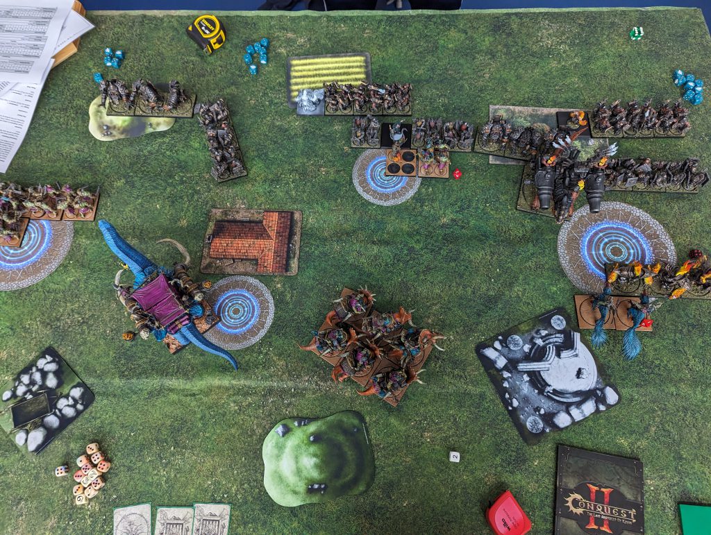 In a moment of accidental genius, I sacrifice my week to let my Triceratops charge in! That Tontor however is not long for this world facing down the Varangians...This was a very cagey game for the first half, both of us trying to set up the aggressive strikes that we wanted. In the end I collapsed my flank quicker than he could mine, and with the Queen sacrifice paying off to reclaim the middle zone I had enough of a scenario and attrition lead to pull out the win. XXX is a great player and a great sportsman, and this game was a perfect example of how Conquest isn’t just about the best stat blocks and attacks. Careful positioning, laying formations and no small amount of luck are more important than picking the best units for your list.