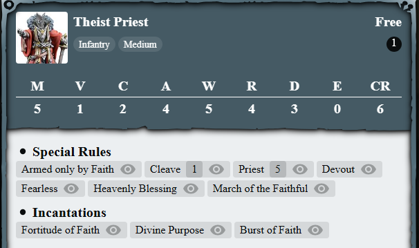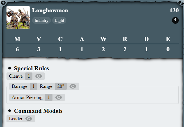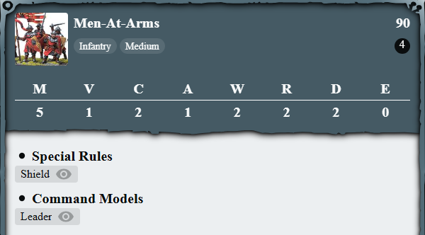 On the top right are the cost to a men-at-arms unit, 90 points. FB is recommended for play at 1,000 points and Parabellum has a free army builder app and in their website to try out build. The number below them are the amount of models that comes with that 90 points - for Men-at-Arms, it's 4. This is a minimum sized for infantry units.