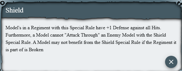Below comes the plethora of special rules and abilities; each of them can be clicked through for more information. Let's take shield as an example: