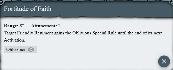For example, they wanted to cast the Fortitude of Faith spell. Which has a range of 8” - meaning it can only affect a unit within 8. Attunement 2 means that it succeeds on a roll of “1” and “2”. Furthermore, if not stated otherwise - each spellcasting needs to have 2 successes in order for the incantation to be successful.