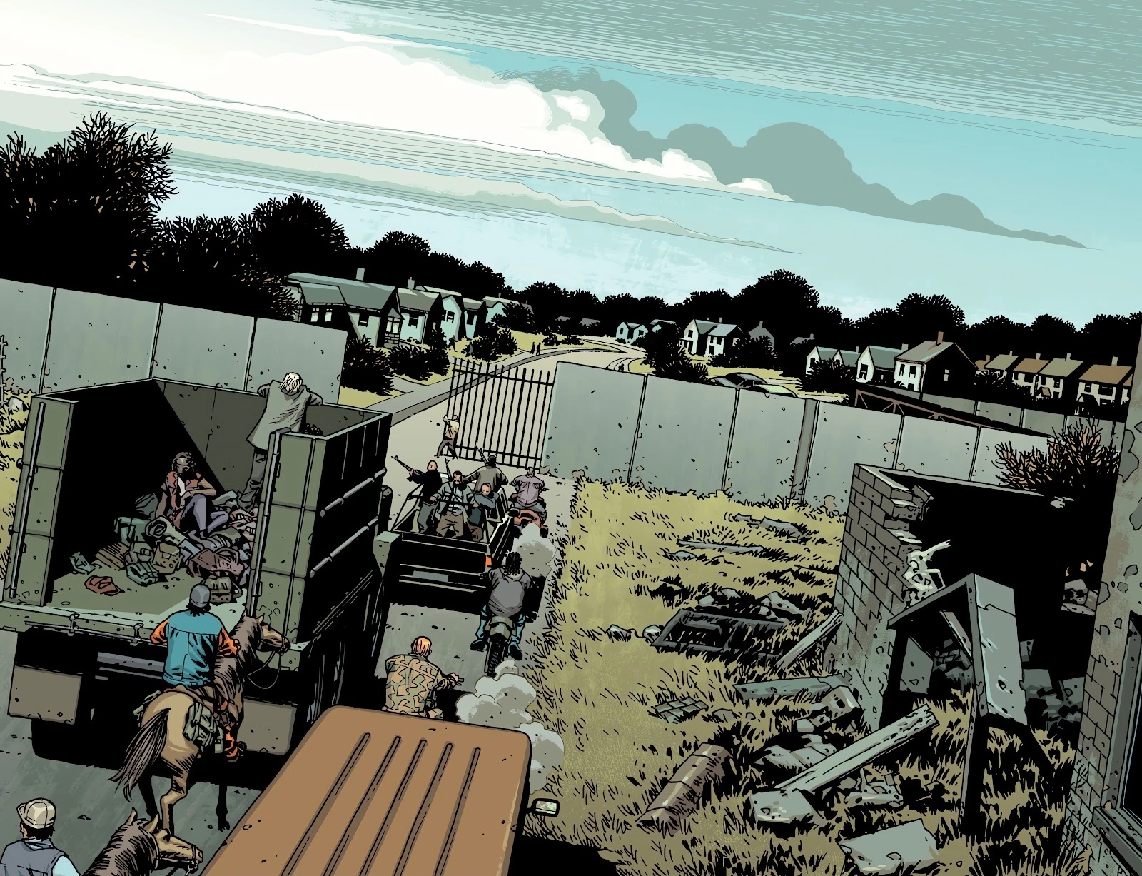 Credit: Skybound EntertainmentThe last issue of TWD is set many many years after the series. We get a glimpse at a reformed world, there is structure and safety again. Walkers are viewed as so harmless that we see Maggie's son showing them off like wild animals in a cage. The world hasn't gone back to what it was, horses still seem like the preferred mode of travel, but the railroad is making a comeback under the instructions of Eugene.