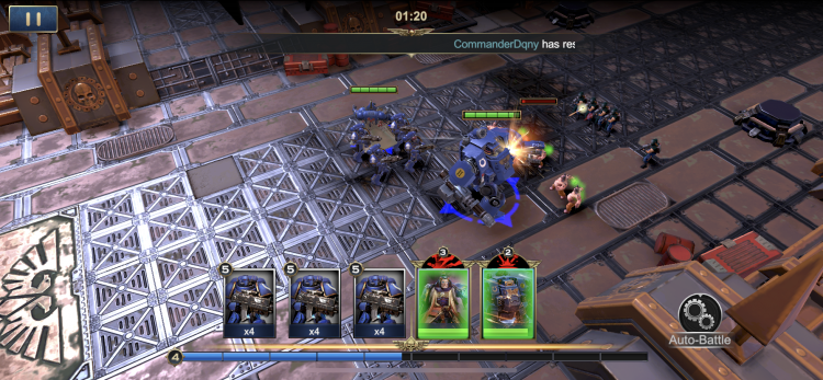 The combat sections are fairly basic. You select heroes who run forward firing their guns and attacking, who build up resource points. You can use those resource points to either activate their special abilities (the Librarian has an AoE attack, my Redemptor Dreadnought has an invulnerability shield) or summon units of troops. Currently I have unlocked Intercessors, Assault Marines, Dreadnoughts, Predators and Whirlwinds. All of these can be improved by upgrading your base. This does give some tactical nuance as you need to work out whether summoning a squad of Intercessors will be more useful than AoE blasting with your heroes, but being the only real combat tactics available I'm not sure how long this will continue to be interesting.