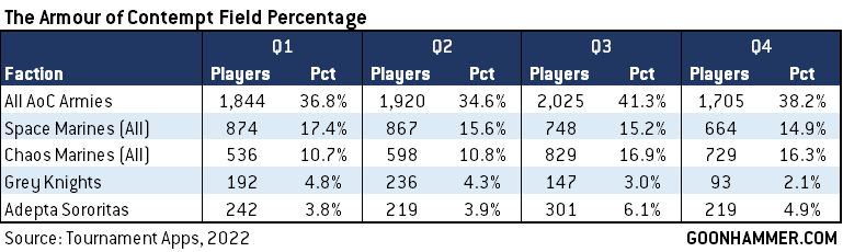 Marine armies have been in decline throughout the year, while on the whole Armour of Contempt armies have hovered around 35-40% of the meta, with a big boost from the release of Codex: Chaos Space Marines in Q3. When it comes to the all-inclusive “Chaos Marines” stat up there, note that Thousand Sons and Death Guard made up 21% and 23% of Chaos AoC armies in Q4, respectively.