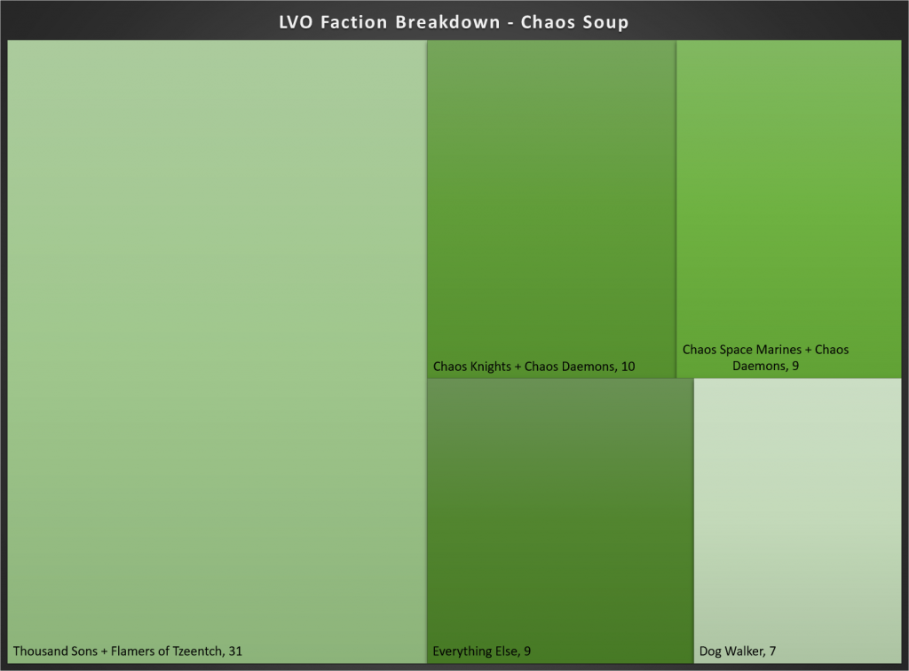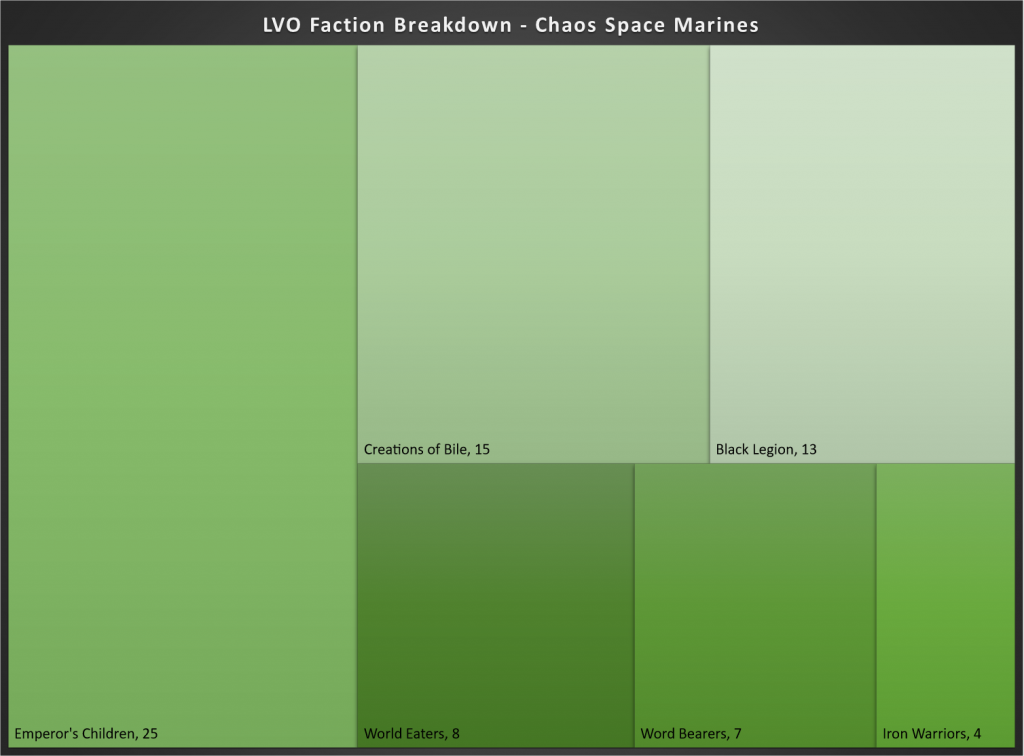 A (relatively) new challenger for the Nephilim season, Chaos Space Marines have come out in force for LVO, representing the second largest contingent of players. As compared to the last three months, where they made up 8.1% of players, Chaos Space Marines have dipped slightly, making up 7.4% of the LVO meta.