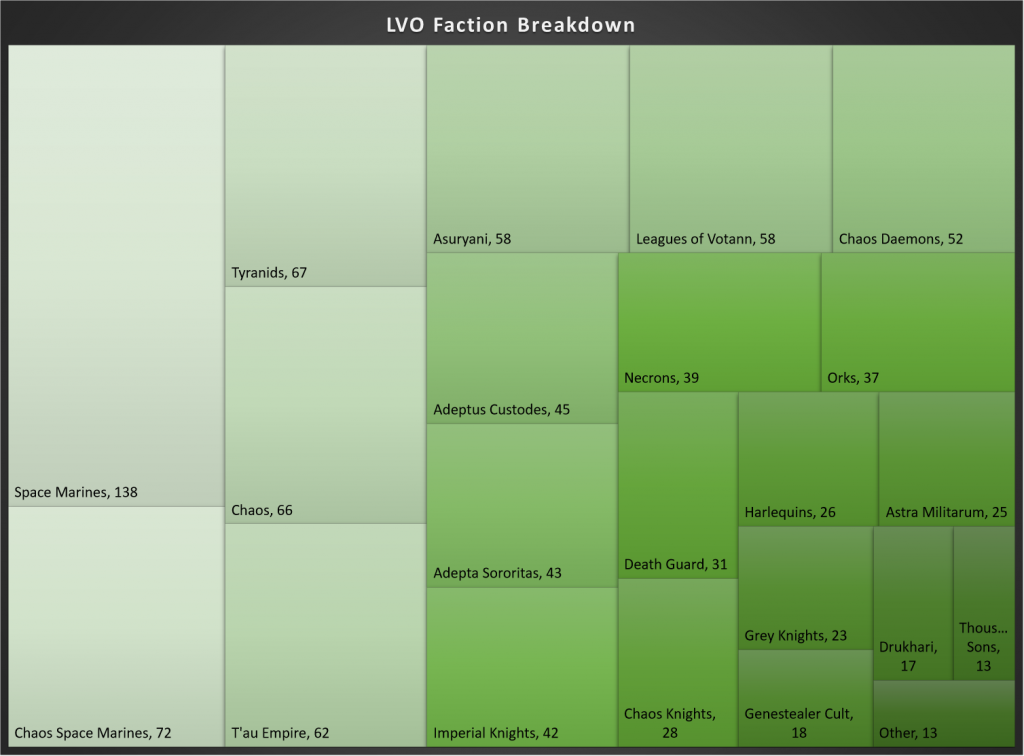 Space Marines make up the largest of the factions present at the event, which is consistent with their representation through the tail end of the Nephilim season - they make up 14% of lists at LVO and have made up 14% of lists during the last three months of GT play. Meanwhile Chaos Space Marines, Tyranids, Chaos Soup, and T’au Empire round out the top 5 factions in representation.