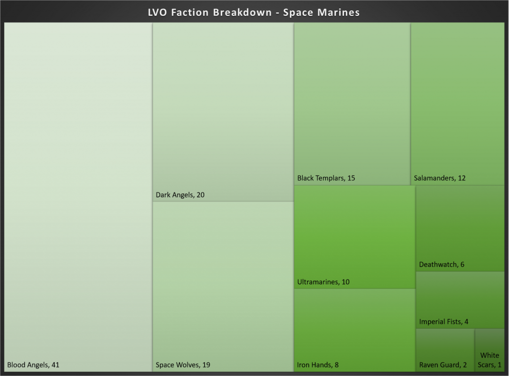 Of these lists, Blood Angels make up the lion’s share, with 41 lists. While Space Marines have struggled as a whole, Blood Angels have seen some success over the last few months, winning the Grinning Demon Series GT in December and the US Open Kansas in November.