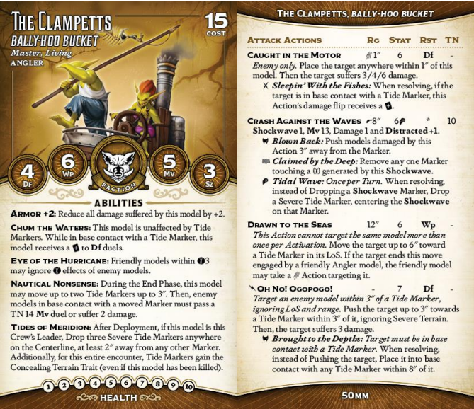 The Bucket is quite a bit easier to hit than Sally (the family's pet Silurid), especially without Stealth, but it's sturdy as heck with Armor +2, and Wp 6 is respectable. It's also likely to have permanent Concealment, thanks to Tides of Meridion - not only do you get three bonus Tide Markers just for showing up, but all of your Tide Markers are one-way concealing all game long (that is, your crew doesn't care about them). On top of that, you can move two Tide Markers per turn, and even deal damage if they bop into someone. This is a great ability and a huge part of what makes the Bucket work - your crew can drop a ton of Tide Markers, but you're usually constrained by the position of your models, and this lets you nudge the markers right where they need to be. Eye of the Hurricane is another hugely potent effect, and one that previously has only shown up on Machinists (who are pretty frail). There are a TON of powerful debuff auras in this game, and the Bucket just... doesn't care about them. Wilds of Malifaux? Don't care! Heated Iron? Don't care! Misery? Oh, you know I don't care.