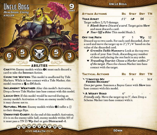 The other thing Bogg is incredibly good at is just being unbelievably annoying. He sits there, with his fat 50mm ass and his gator. You can't Interact near him without discarding a card. You can't make attacks near him without suffering a -twist to damage. Every time he activates, all of your nearby models have to test or gain Distracted (as long as he's at least partially over the centerline. And you can't even move him! Plus, he spews out Tide Markers every time he activates, for free - so attacks against his hefty Df 6 have to deal with a built in +twist, too.
