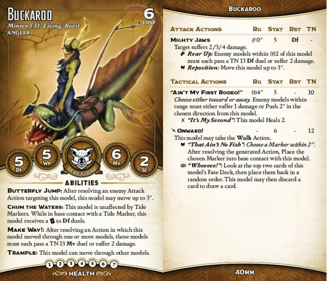 Buckaroos are, basically, scheme runners. They're even faster than Silurids, with Mv 6 and Onward making up for the lack of Leap. They can even plow right through models, though they don't ignore terrain. Silurids are famously fragile, though, and these guys are even moreso - one more health does not make up for the lack of Stealth. In melee, Chum the Waters might help them stay alive a bit longer, and they do have the cute interaction of being able to Butterfly Jump through the thing that just hit them and force a test to avoid damage, but mostly you don't want them in melee. Ain't My First Rodeo is a cute action, with an S tier trigger name, but giving your opponent the choice means that it's hard to see it really working out. And while they can drag Tide Markers around, they can't make them.
