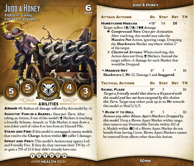 It's not like the rockets are his only trick, either. Shootin' Fish in a Barrel is harder to trigger than you think it's going to be, because Clampetts tend to drop tide markers close to themselves and Judd is firing at distant targets, but on later turns it'll be an option. Remember that the 8s it draws are just high enough for Judd to hit all of his TNs when he's using Spray and Pray. Stand and Fire is not that hard to trigger (but remember to keep him unengaged) and the ping damage adds up. Signal Flare is the other really spicy rule on his card, though - that's a massively long-range heal or movement, and if you have an 8 or higher it even ignores LOS. Finally, both of his bonus actions are great. Aunty Mel in particular likes it when her Adversary target can't benefit from Cover.