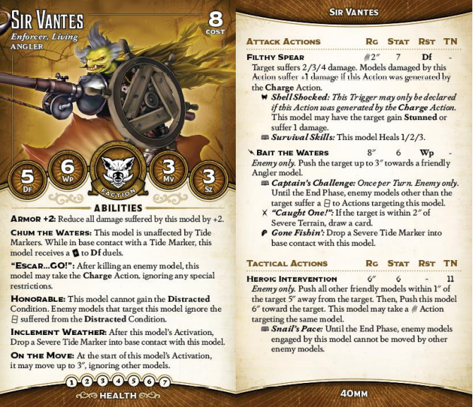 Fortunately, he has another way to engage: Bait the Waters lets him yoink an enemy towards him, and the way the math on the ability works out, as long as the push wasn't slowed by terrain or other models he's guaranteed to be in charge range of the target. The triggers on it are pretty sweet, too. Drawing a card is always nice, dropping a Tide Marker is appreciated (though, admittedly, not that big a deal with how many this crew makes passively), but Captain's Challenge is sick. Vantes is already pretty durable, with the +twist to Df, Armor +2, and self-healing. Adding Challenge makes him unreasonably hard to remove for an Enforcer.