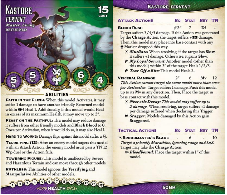 That's not all for his front of card; this version of Kastore is blessed with Faith in the Flesh, which is the Returned Keyword ability (a little odd that OG Kastore doesn't have it, but what can you do?). When he activates, he can take a point of damage to let a nearby Returned model heal for 1, and if he would overheal he can shift 2" instead. That's really, really strong; there's a ton of healing in this keyword, and turning every single overheal into a 2" move (not push), not even once per activation or anything, adds up fast. And to help trigger Faith, he has another, confusingly-similarly-named ability in Feast on the Faithful: any damage he suffers from friendly models and the Black Blood ability may be reduced to 0, and once per activation heal 1 as well. This is obviously enormous: you can safely charge him with friendlies to get their triggers without taking damage, and in fact you can push him 2" each time. Kastore is going to spend a lot of time getting ferried around the board via swift kicks to the ass.