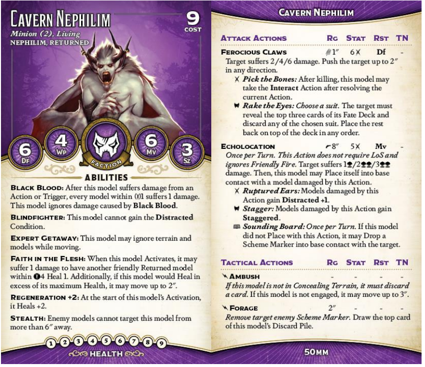 Having skipped arm day, their attacks are significantly less impressive than a Mature Nephilim (that min 3 really matters, as does a 2" engage, and Matures have much better triggers), but they're blessed with a ranged attack. Echolocation is extremely cool: low range is mitigated by ignoring LOS (and thus effectively ignoring Cover and Concealment in addition to Friendly Fire), and low Stat is mitigated by targeting Mv. The damage track isn't much to speak of, but those blasts are great, and the ability to teleport to anyone you damaged gives them insane mobility. The attack comes with free Distracted, just because, and sometimes inflicts either aoe Stagger (always good) or does its best Draw Out Secrets impression. That's always a very strong trigger, and the sheer amount of versatility in one 8" projectile attack is impressing me.