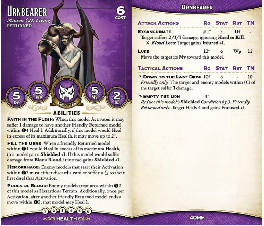 Let's start with the auras. Urnbearers have four separate aura effects on their front of card. Faith in the Flesh is shared, and Hemorrhage and Pools of Blood are basically both debuff auras - enemies that move nearby take damage, and enemies that start nearby get taxed a card if they want their first action not to suck. Of note, though, Pools of Blood also lets you ping out healing without spending AP, which is super super good: think of all the effects that trigger when you overheal, and now think about triggering those effects without spending an AP. For example, if you move the Urnbearer up once, all your other models get an effective +2" of movement by just ending their first Walk action near the Urnbearer... but it also works to extend Charges, too.