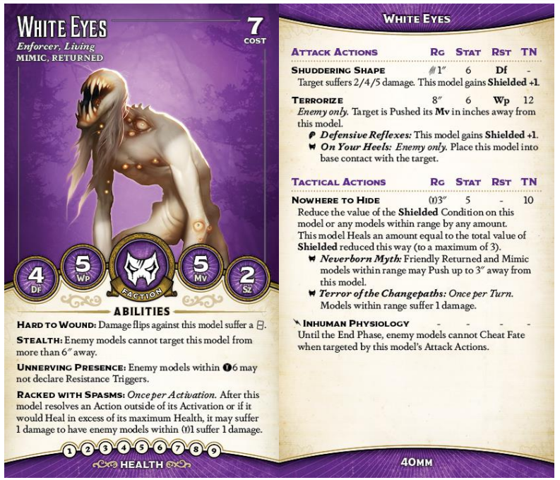 He's part Mimic, which is very strange (what is it with Kastore and sharing his keyword?) and I think you'll see him in both crews. He has Stealth, Hard to Wound and a ton of health for his cost, which is good because he spends it on Racked with Spasms to pulse out ping damage. The synergy there is a bit odd; triggering Racked requires you to overheal, but it then damages you, which makes it less likely for you to overheal on the next heal... this creates some tempo issues, but free ping damage you don't even have to spend an AP for are great. Sometimes you'll be in a position to trigger this on 3-4 separate activations by pumping healing into White Eyes and it'll just ruin someone. You can also just eat the damage with Shielded, which White Eyes gains every time he hits someone. His attack is otherwise not great, and it has no triggers at all which is very weird, but combined with Eta Kithae he turns into a real engine: overheal him, giving him shielded, then immediately lose the shielded to Racked with Spasms and pulse out damage.