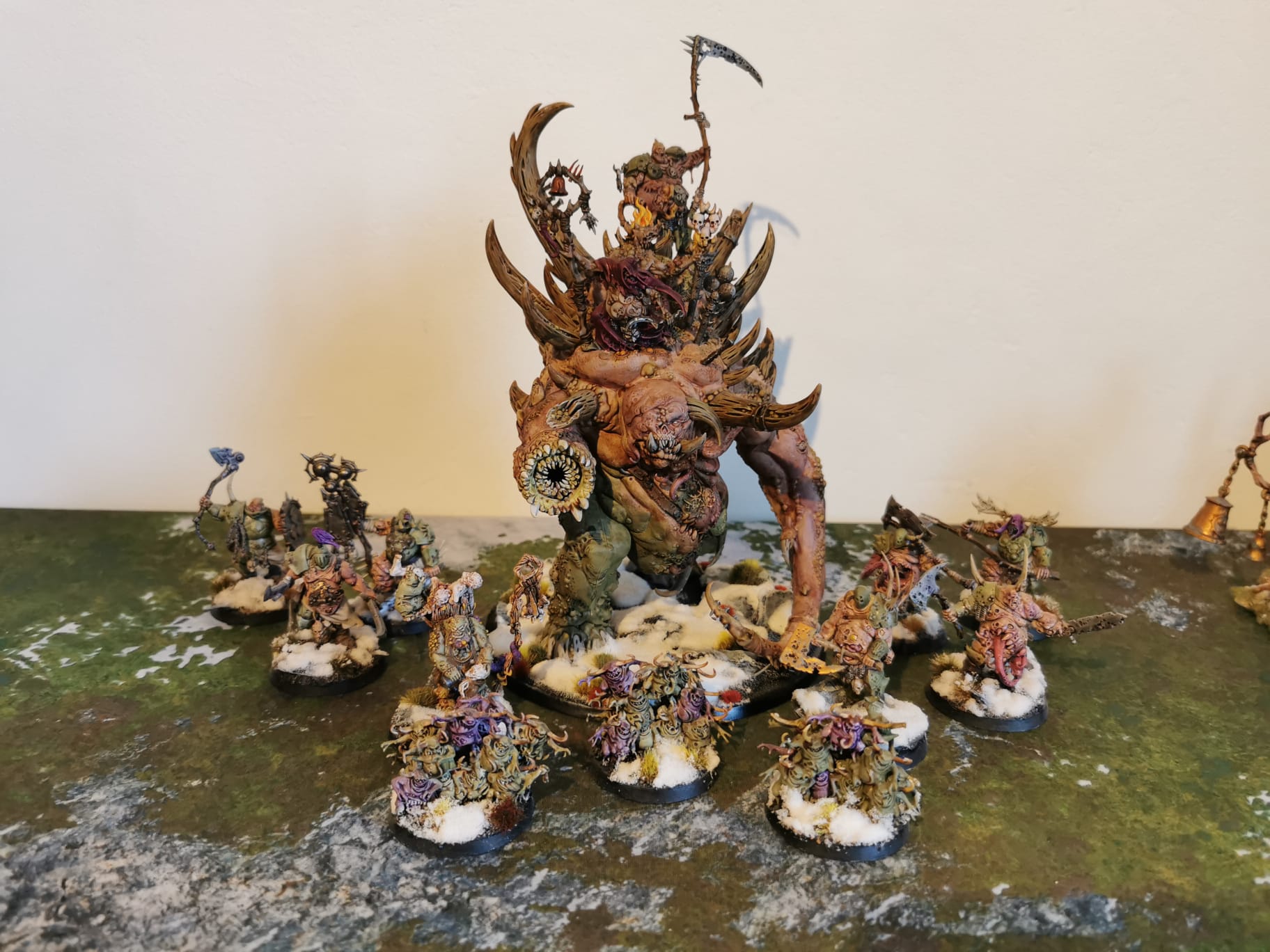 An interesting twist is that Daemon units that are not Heroes are not recorded on your roster at all. A concept first introduced with the Seraphon Tome Celestial, when setting up your army for battle you instead can choose 3 daemon units per Great Unclean One or the Glottkin and 1 per Nurgle Daemon Hero. So if you have 1 Great Unclean One, a Sloppity Bilepiper and a Poxbringer you can choose up to 5 Daemon units for your army for that battle. This represents that most lesser daemons are amorphous and tend to fade back into the Realm of Chaos once their short-lived existence has ended.