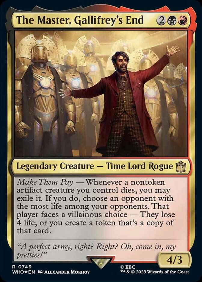 For each suspended card you own and each permanent you control with a time counter on it, you may add or remove a time counter.BPhillipYork: This is pretty cool; I think suspend cards are fun and don't see enough play in Commander and having more of them and more support for them is cool and a good thing. It can lead to more deck diversity and is very on-point, flavor-wise for the ostensible focus of the Doctor's purpose as a Timelord. Though I've never been clear on whether he's supposed to be a weird like, non-interfering benevolent version of Q and not affect causation - it mostly feels like the whole time travel thing is just an excuse to bounce around in time with new sets and weird characters. Besides, the Doctor's powers are wasted on things like "resolving wars" and "saving alien species" and not "stopping humans from discontinuing the Choco Taco."