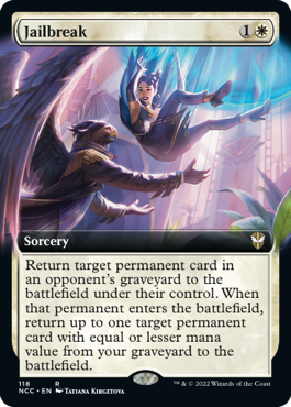 Just like in middle school gym.Moreover, White is actually the second-best color when it comes to recurring cards from the graveyard directly to the battlefield, and in some cases, the absolute king. I would argue Sevinne's Reclamation is the single-greatest White card in Commander, as its flexibility, scaling throughout the game, allows it to both help you bounce back or win outright, depending on the tools at your disposal. Sun Titan is also here, yet while many would think it a bit too slow, the fact we make so much mana, and even have some loopable win conditons with the card, ensures it still has a place in a 2025 brew. Yet, while Sevrec is good, and Sun Titan at least used to be a staple, I want to draw your attention to one of the most underplayed cards in White: Jailbreak. At face value, this is kind of a one-time use Sevrec with some riders, although looking a bit deeper, it's much more fun; Jailbreak is a phenomenal political piece, able to return threatening components to the opponent's board, or get back their removal, all while keeping your board stacked with the best tools available in your graveyard. At worst, given all the fetchlands we're playing, this is kind of a white Nature's Lore, so long as at least one opponent is also on fetchlands. In that sense, it even helps with Beza, as while we do ramp up, so does at least 1 opponent, keeping us behind.