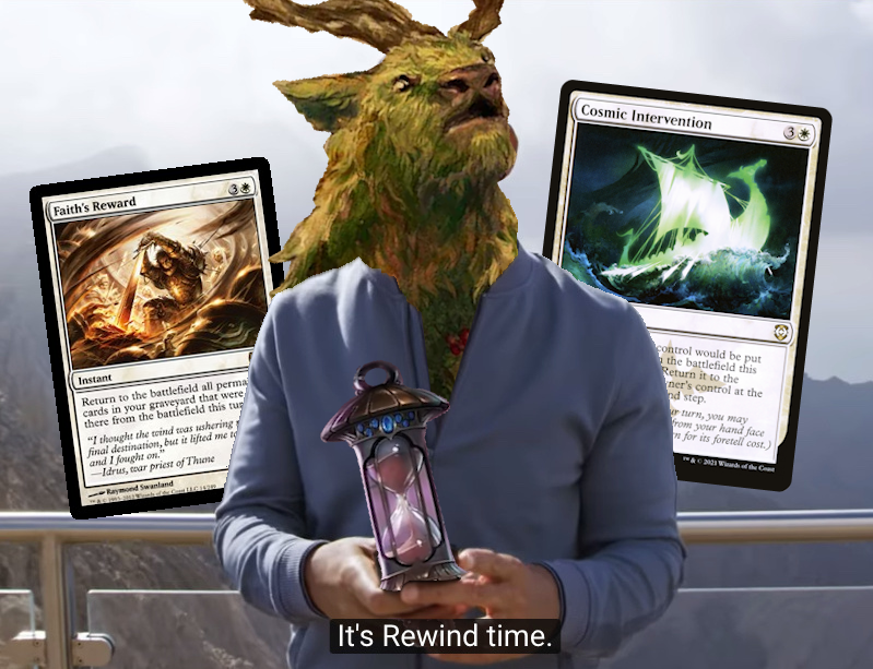 Beza innately wants to be staying behind on lands, that much is clear. Unfortunately, most of the ways to ramp naturally involve either assembling a hoard of Treasure tokens (a reasonable ask, given the elk's Enters trigger) or acquiring more lands; the clearest solution is taking a cue from the deck's prolific usage of Equipment, and focusing on untapping the lands we do have, rather than finding more. The three caballeros responsible for this, being Lost Jitte, Pip-Boy 3000, and Sword of Feast and Famine, all accomplish this task differently in ways worth elaborating on. Jitte triggers on any combat damage, and allows you to 'bank' counters, waiting to pop off once you have a use for the mana, whereas Pip-Boy is an attack trigger, but untaps two lands in the process. Feast & Famine should already be a known villain to most players, however, requiring you get through to a player often beholden to the two most popular colors in Commander, Green & Black. Deserted Temple also comes out swinging in this list, being a land that untaps other lands, which can have cascading value with our multi-untappers, alongside Thespian's Stage, which isn't just copying Dark Depths for the umpteemth time. Instead, you'll be using it to ignore unfavorable Enters conditions while reaping the benefits of untapping some very specific lands. In a normal strategy, these untaps usually net you a single mana, but here, it's almost always going to be much, much more.Now that you know Beza wants to be untapping lands and sacrificing its board to remain behind, it's time to talk about the other two subthemes present: Faith's Reward effects, and lands that tap for 2+ mana. Cards like Lotus Field both put you behind on lands but also have cascading mana advantage when untapped, similar to Lotus Vale and Scorched Ruins. Ancient Tomb, already a profoundly broken card, puts you behind on life so Beza accrues maximum value. Arid Archway, as mentioned, is reasonably tutorable, taps for 2, keeps you land-neutral, et cetera. That being said, if we're constantly sacrificing lands to other lands that makes us fairly vulnerable to removal, or even just being a bit slow. Furthermore, given how scary the Altars are, we're likely to draw ample removal once the engine's online; unlike a lot of decks, Beza doesn't counteract this with protection, but instead readily bounces back from interaction by way of Modern Eggs' gameplan. Let's segue into that.