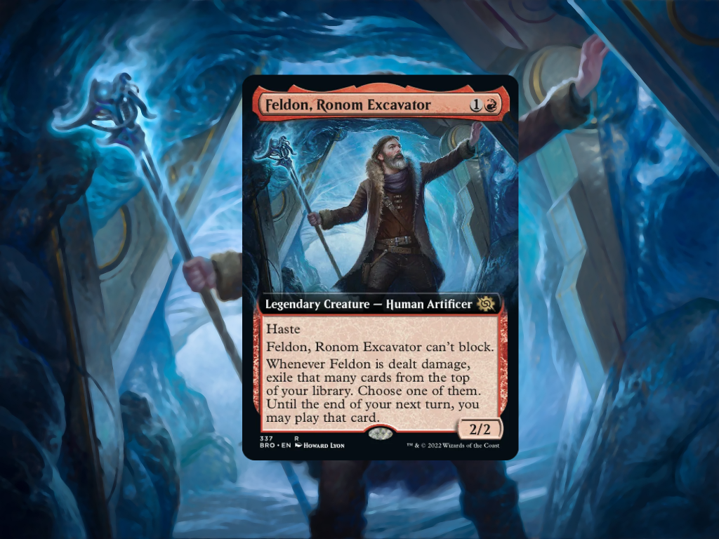 Let's start by stating that Feldon here isn't the most obvious candidate for the Command Zone. Sporting a shape, as an aggressive 2/2, that doesn't tend to enmesh with the format's midrange identity, Feldon will find himself dead on the ground with only 1 card to his name if handled improperly. Certainly, if an opponent blocks with their Jodah, the Unifier your Commander will die, and while you get to pick your favorite card from among 6+ in that scenario the rest are inextricably lost to exile. That's the beauty of it. Feldon often requiring you to pick the single best card from exile from a batch puts you in a tough spot—do you take this boon, or that? Party Thrasher or Runaway Steam-Kin? In forcing you to make a genuine choice that feel of a roguelike is embodied in a card which surprisingly has more going on than appears so. You get until next turn to cast the chosen card, so you can readily tap out, and given Feldon has Haste cards such as Nemesis Mask can push opponents to give you a massive swath of cards to choose from. In fact, sending Feldon into precarious situations is one of the better means of churning through cards in your library, as in a roundabout way this deck operates much like a self-mill strategy...with much less accessibility. You've Been Caught Stealing & Impact Resonance both make ample use of the fact that Feldon is so accident-prone, and while you're incentivized to keep your opponents' boards thick with Creatures, being able to wipe them away with a moment's notice is duly appreciated.Casting from exile is among the most supported of Red's modern archetypes, and since the popularity of Prosper they've included ample goodies in every set. Feldon's favorite among these come in the form of Spells which cheat a bit against their intended design context, Delayed Blast Fireball & Ultimate Magic: Meteor. Each of these has Foretell, which is an upfront cost of {2} to cast them later from exile, their secondary effects being stronger when cast beyond the hand. With Feldon however, we're often ripping them off the top directly from exile, saving 5 mana on a massive 5 damage Fireball, and destroying potentially 3 Artifacts or Lands with Meteor. These are facilitated by exile-specific ramp, like Interdimensional Web Watch & everyone's favorite Lizard Wizard, Party Thrasher. Cards like Fury, Cave-in, & Pyrokinesis are also stellar hits to exile, given we can cast them for free with the alternate cost, making immediate use of them. Feldon does graciously allow us to play cards exiled with him until our next End Step, so we get a little reprieve if we run out of mana, but always remember to damage him before making a land drop, as he's a stellar means of consistently hitting Lands! Furthermore, while we exile all these cards, be on the lookout for either Squee, the Immortal or Eternal Scourge, who ideally end up there for a lategame combo we'll cover in a bit.