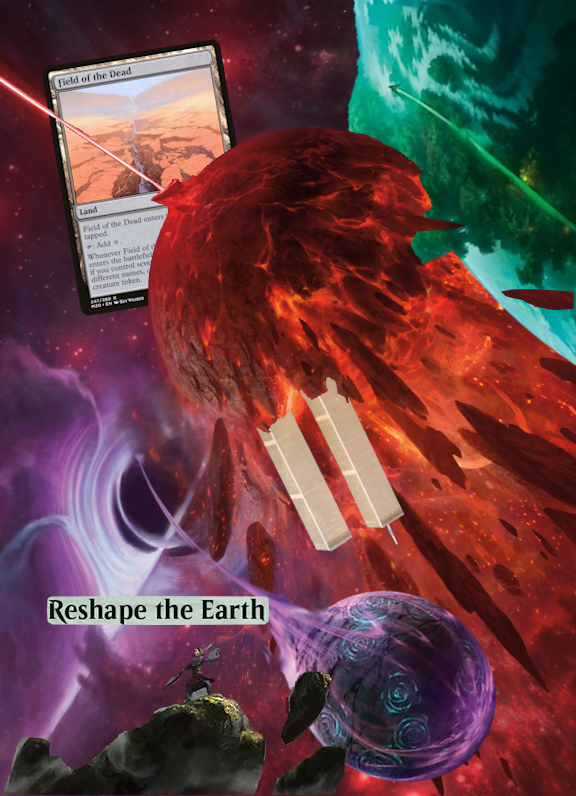 Ten lands is a lot of land, and for most decks that aren't dedicated 'lands decks', it's often more than a normal player will have in a single game. Ten is also, for the astute among you, more than nine, the critical threshold for our haymaking spells. This means that investing in a Reshape first and foremost ensures you don't even necessarily need Cecily for future turns. Importantly Reshape is also for non-basics, so while there is some push-and-pull between playing a greedy mana base and one that can consistently generate all four of our colors, there's room enough for tools to make this card really hurt. For anyone that survived the format surrounding GP Denver 2019, the interaction between our first Game Changer, Field of the Dead, and multiple lands entering at the same time should trigger alarm bells. Field sees every land enter alongside it, producing Zombies galore as chump blockers or fodder, but thanks to Vesuva it can represent 20 Zombies, if you already have Field out. Aside from this powerhouse combo, though, we're also playing three of the new Planets from Edge of Eternities to make instant use of these tokens.