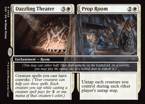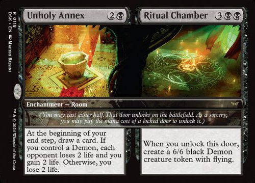BPhillipYork: I like the idea of caring about Demons, that’s a neat place to be for black, and this double Room card actually makes sense. The two Rooms interact with each other in a nice but not imbalanced way, just a solid all around card with nice theming. Essentially comparable to a more expensive Dark Confidant but draws you one the turn you drop it and it doesn’t lose you life (actually potentially gains life, and causes life loss to opponents). So really a bit of power creep.Marcy: Conditional Phyrexian Arena, which is also still in Standard, so pop a Sheoldred into your deck and just draw with no consequences!
