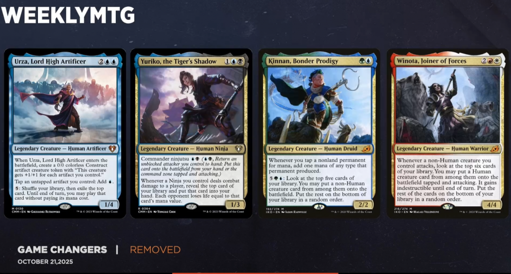 These are legendary creatures which are being removed from the Game Changer list due to their nature as being potential commander options. Gavin's explanation here is that commanders are a piece of information you know before the game, so being a game changer isn't as necessary due to typical rule 0 conversations that tables can have, and being off the Game Changer list makes them more viable to show up in the 99 in other brackets.- Urza, Lord High Artificer