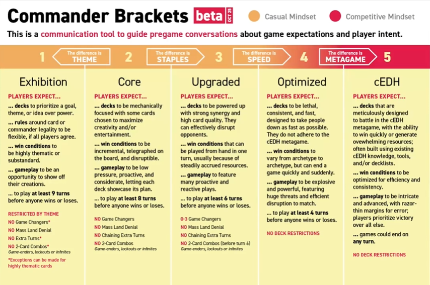 There are some key updates here that are worth noting, besides just a new infographic. First and foremost, Bracket 2 has been detached from Preconstructed decks (now called "Core" and is being more defined as a sort of "baseline" power level that Preconstructed decks will often fall into. Bracket 1 is now labelled "Exhibition" and is now more used to describe its intent for thematic decks. Tutors have been removed from the bracketing as well - Gavin noted that many of the stronger tutors are already Game Changers, so other tutors are fair game now. They also now have game length expectations in regards to how many turns games at each bracket should typically take before someone can close it out.