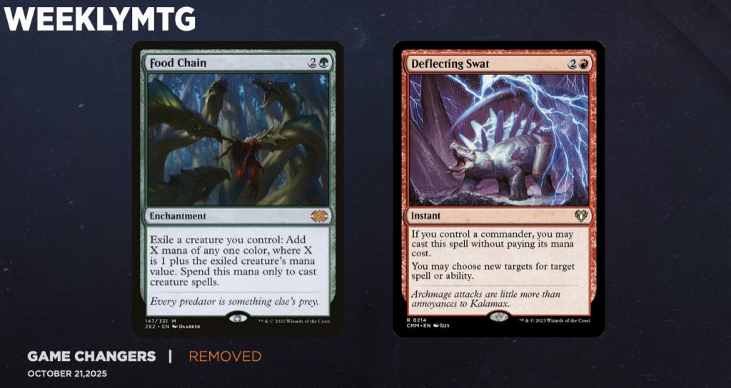 BPhillipYork: These seem fine; Deflecting Swat is really really strong, but red has taken a hammering in the last year for cards getting banned, so it's a bone to throw. The Swat is less crazy than blue's bevy of free counterspells, since they can both protect a win and stop a win, whereas Swat is a lot less able to interact with many win cons, virtually anything that is dependent on consistent or repeated interaction with permanents, whereas a counterspell just stops the last combo piece from hitting the board. Food Chain is generally a dedicated combo card, and taking it off the list seems fine. You could do some fun decks that rely on copying permanents and then exiling them for mana, which would be strong but extremely clunky, and in any case Food Chain is a one of a kind card that can just be blown up.
