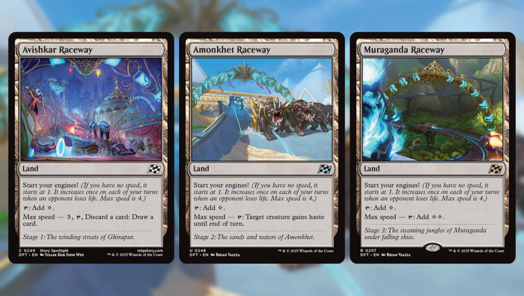 Credit: Wizards of the Coast.On the topic of mulligan-dependent gameplans, why not double down and take a look at everyone's favorite recent parasitic mechanic, Speed. Speed is a trait, like Monarch or The City's Blessing, which a player has as soon as a card with Start Your Engines hits the board. Beginning at 1, Speed scales once per turn, up to 4, at which point you're capped and the best payoffs all turn on. Importantly, without a means to copy the trigger, the soonest you can reach max speed is turn 3, by 'starting your engines' on turn 1 & making an opponent lose life that turn to get to 2, then doing the same on turns 2 & 3. Few as they are, the means of hitting this ideal curve (or one turn slower) are often dependent on the raceways, Avishkar Raceway, Amonkhet Raceway, & Muraganda Raceway. Coupling these with a Colorless Creature, ideally with Haste, or some other way to deal damage is vital during our mulligans; much the same as our Pregame actions we can increase the odds of a given hand to have at least one of these premier accelerants.