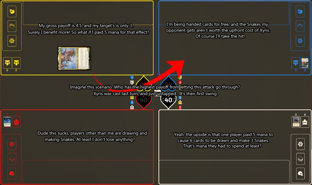 Having Flying does make Xyris implicitly harder to block, but imagine we can (or kill it) here.What is a single card worth? How about a Treasure, or a Snake token? In order to qualify the choices made when looking at whether someone should willingly allow Xyris to connect, we have to associate values with the resultant effects—here, let's say a 1/1 is worth about ~0.5 mana, and a card is worth 1. These are our payoffs. Upon connecting with the Serpent, you see a gross payoff of ~4.5 mana, between 3 cards and 3 Snakes, while the player that took the hit sees a gross payoff of 3 mana, and the uninvolved parties see a gross loss apiece of ~7.5—two of their opponents are accruing advantage, and while nothing's happened to them, positive or negative, a benefit to two opponents is doubly a loss. Hold on though, because that number isn't quite right, as Xyris himself costs something; a player begins this strategy set at a deficit of 5 mana. While in terms of gross exchange the controller is up 4.5 mana, their target 3, and bystanders -7.5, the net payoff (once accounting for opponents with a direct change in mana, meaning bystanders are solely represented by the payoffs of their opponents) is respectively -3.5, +3.5, and -2.5 mana. Wait, what?