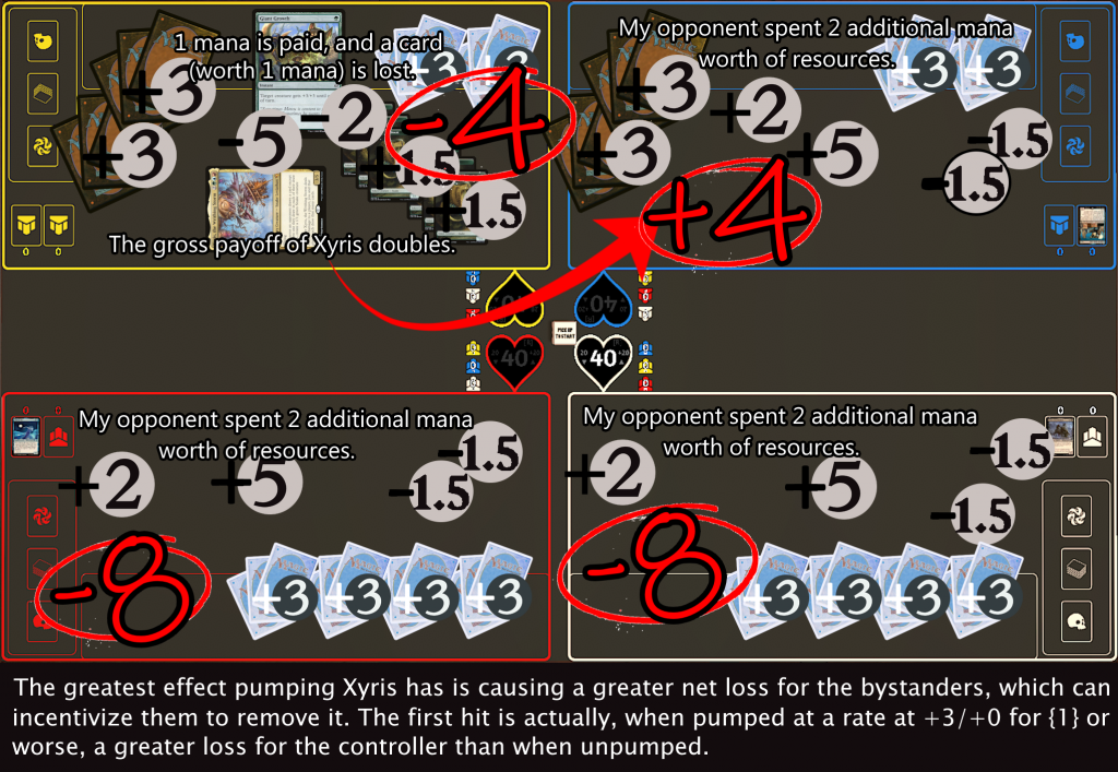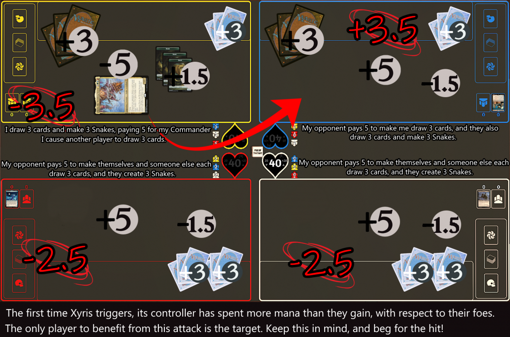 Turns out a 5 mana Commander that gives opponents cards isn't strictly upside. Or upside at all, the first time.While the first Xyris combat damage trigger results in +4.5 mana net, between 3 cards and 3 Snakes, it costs 5 mana to start, and provides an opponent with a 3 mana payoff. The player with the lowest input receives the largest net payoff, and even bystanders are greater beneficiaries than the Xyris player for the first hit, even though they aren't drawing any cards or making any Snakes. While this is theoretical, and therefore belies the ample context that comes with complex Commander game states, this model suggests the first rational player to be attacked by an unmodified Xyris should take the hit, all the time. But what about pump spells? There's a fairly famous video that covers a budget Xyris deck composed almost entirely of so-called 'pump' Spells, which buff Xyris to result in additional cards and Snakes. If you cast a Spell for {R} to give Xyris +3/+0, as an example (counting as ~2 mana for the mana spent *plus* it being a card itself), you'll be drawing 6 cards and making 6 Snakes, for a total of 6 mana and 1 card to pump (a cost of 7). The problem arises when you look at what your target gets, 6 cards for no cost—this takes your theoretical +2 payoff back down to -4, and after the dust settles, the target sits at a cool +4, between their 6 shiny new cards and your ~7 mana cost, reduced by your 6 cards and 6 Snakes. Poor bystanders, they're sitting at exactly double their previous loss, at -8.