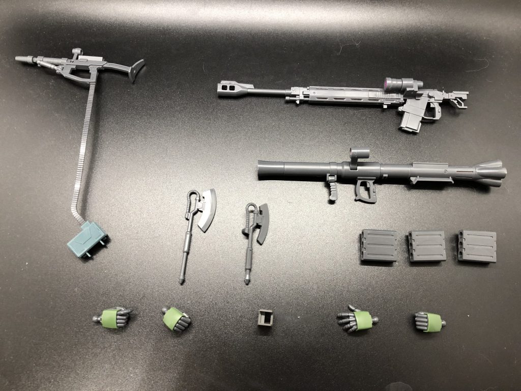 HG Zaku II C-6/R6. Credit: Greg ChiassonYou can have a lance, or a lance with a drill on it. Mobile suits from Iron Blooded Orphans, in a timeline where smashing things up is more popular than shooting them, mostly rely on huge wrenches and chainsaws, but they also have railguns. Gundam 00 has a sniper rifle that can shoot from the ground all the way to geostationary orbit. There are beam boomerangs, which are more of a butterfly knife, and several types of whip: regular, electrified, or made from lasers. Someone in the EFSF built a fairly accurate AK-47 replica that’s 30 feet long, there really are no limits.