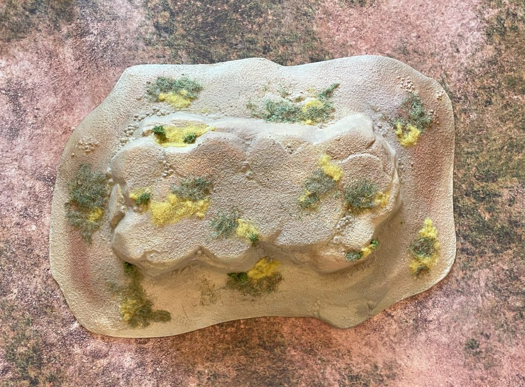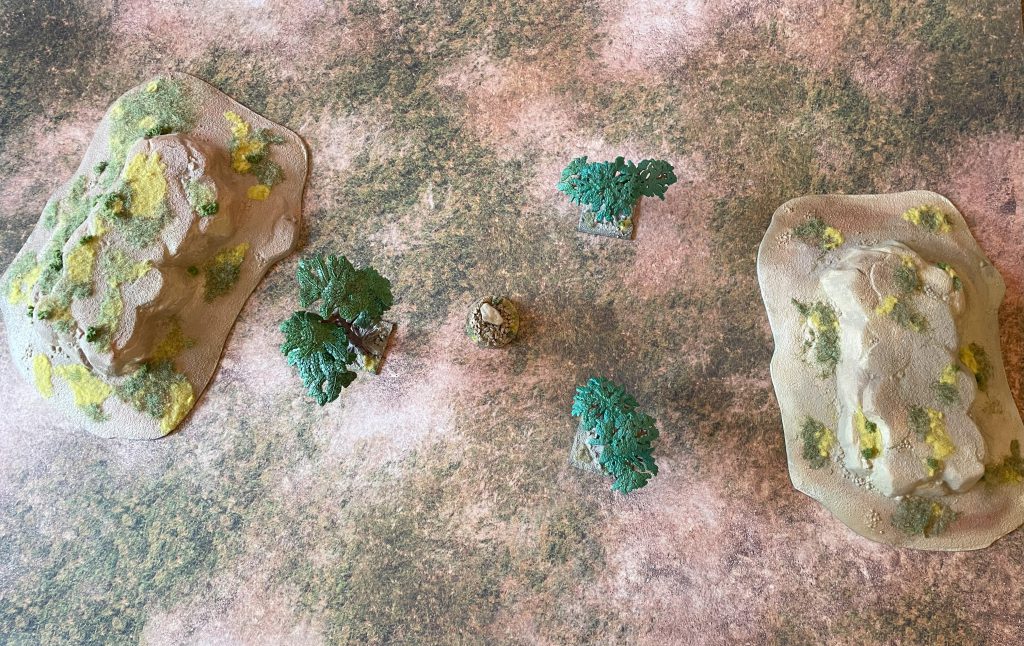 The mechanical is the easy bit. Let’s take the only bits of completed terrain so far - two rocky hills - and the constraints of my tiny dining table. There’s only one way they can both work on the mat, and that’s having them on either flank of the board. That isn’t ideal and in games where “going up a hill” has some kind of effect, all we’re doing is funnelling the entire game into the central section. Luckily, neither Saga or Barons’ War cares much about hills beyond line of sight, so we might get away with it.