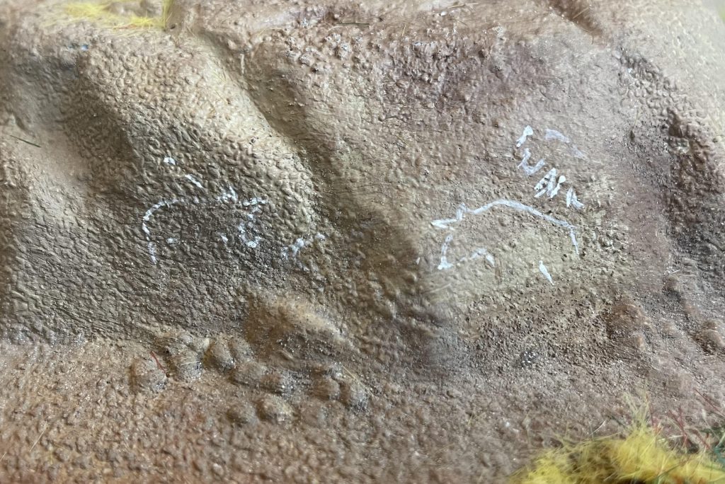 If I was playing a miniatures game set in the Mesolithic or early Neolithic, we might well stop there. There’s a valley, and some people are roaming across it. The traces they leave are ephemeral, not large or persistent enough to mark out in 28mm scale. Where they might leave a mark is in Saharan rock art, a long and enduring tradition of Saharan pastoralists, hunters and early farmers creating fantastic art either painted or carved into their landscape. To add that first human layer to the palimpsest, I’ve drawn some approximations of the Qurta Petroglyphs onto the hills - a mark of 20,000 years of detectable human occupation.