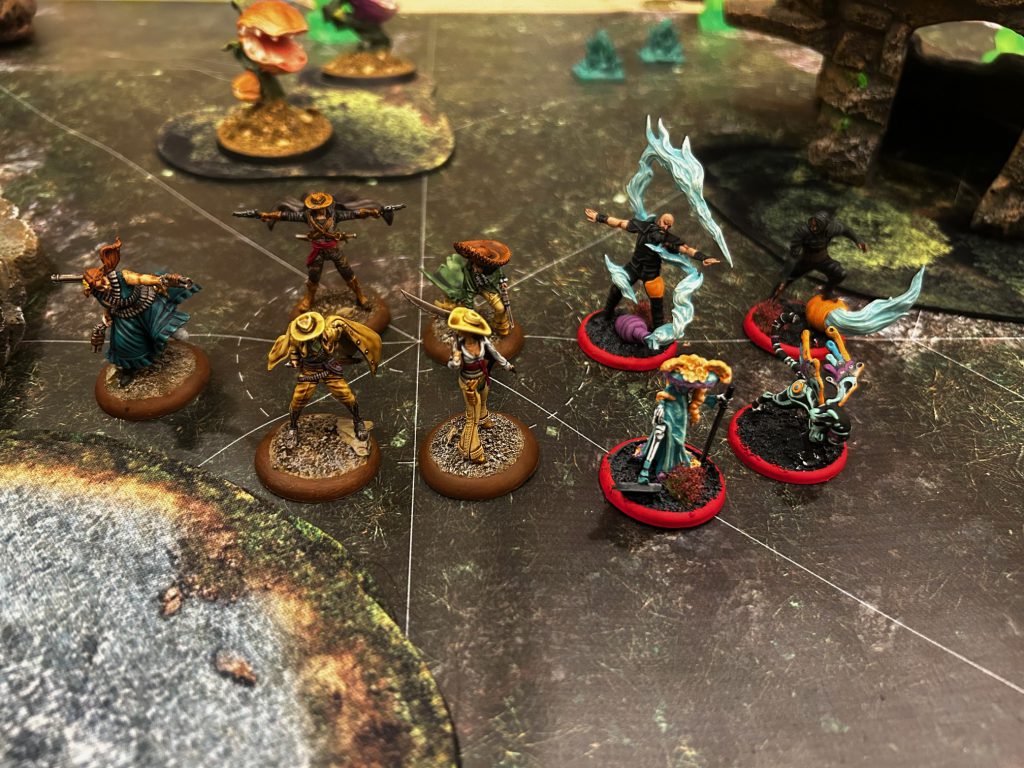 L->R Back: Monster Hunter, Pistolero de Latigo, Francisco Ortega, Director Rodriguez, Ashbringer. Front: Pistolero de Latigo, Perdita Ortega, Lady Justice, Scales of Justice (those last two are from the Rotten Harvest Justice crew, which is Day of the Dead themed). Credit: LandonFrancisco with an LLC is a terrifying, near-unstoppable killing machine, especially once Perdita starts larding him up with upgrades. He had a low model count for Cloak but four unstoppable juggernauts (one literally with the action Juggernaut). I had to basically lock him down and drown him in AP to have a chance. I took Sweating Bullets since I had a lot of 2" engages and Ensnare to use all of that AP I was going to be generating. I considered Protected Territory, but with summons and a Leap his crew was too mobile for me to reliably score it. And the other two schemes were right out.