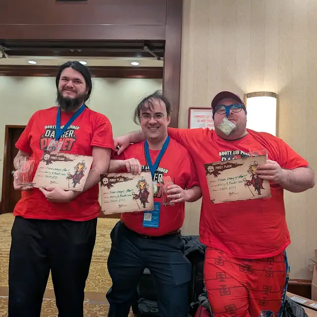 Look at these goobers! I had already put on my hat to leave, so this is hat-head. My hair isn't normally doing this. Credit: Nathan Linder, Brandon Lane and me!I think I'm shelving Brewmaster for a while. He's fun, but games a bit samey, and he's way, way too good. I'll pull him out when I need to win, but I really want to put some time in with Ulix this year, or even try another faction. My Explorers are calling me...