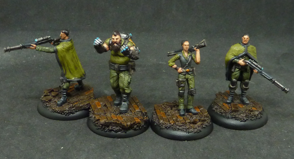 L-R: Catalan Rifleman, Catalan Brawler, Yannic Waller, Catalan Rifleman. Credit: SoylentRobotLike the Neverborn, the Outcasts get their starter box contents in this book. The Catalans are an odd bunch; they're Versatile, so any Outcasts can hire them, but they also have the Syndicate keyword... which is an Explorer's Society keyword. Weird! They represent the Catalan Company, a storied mercenary band who serves as the security on Condor Rails. Yannic is their leader, a slight woman with one high and a potent shotgun. Mostly, though, you're taking her for Ingenuity.