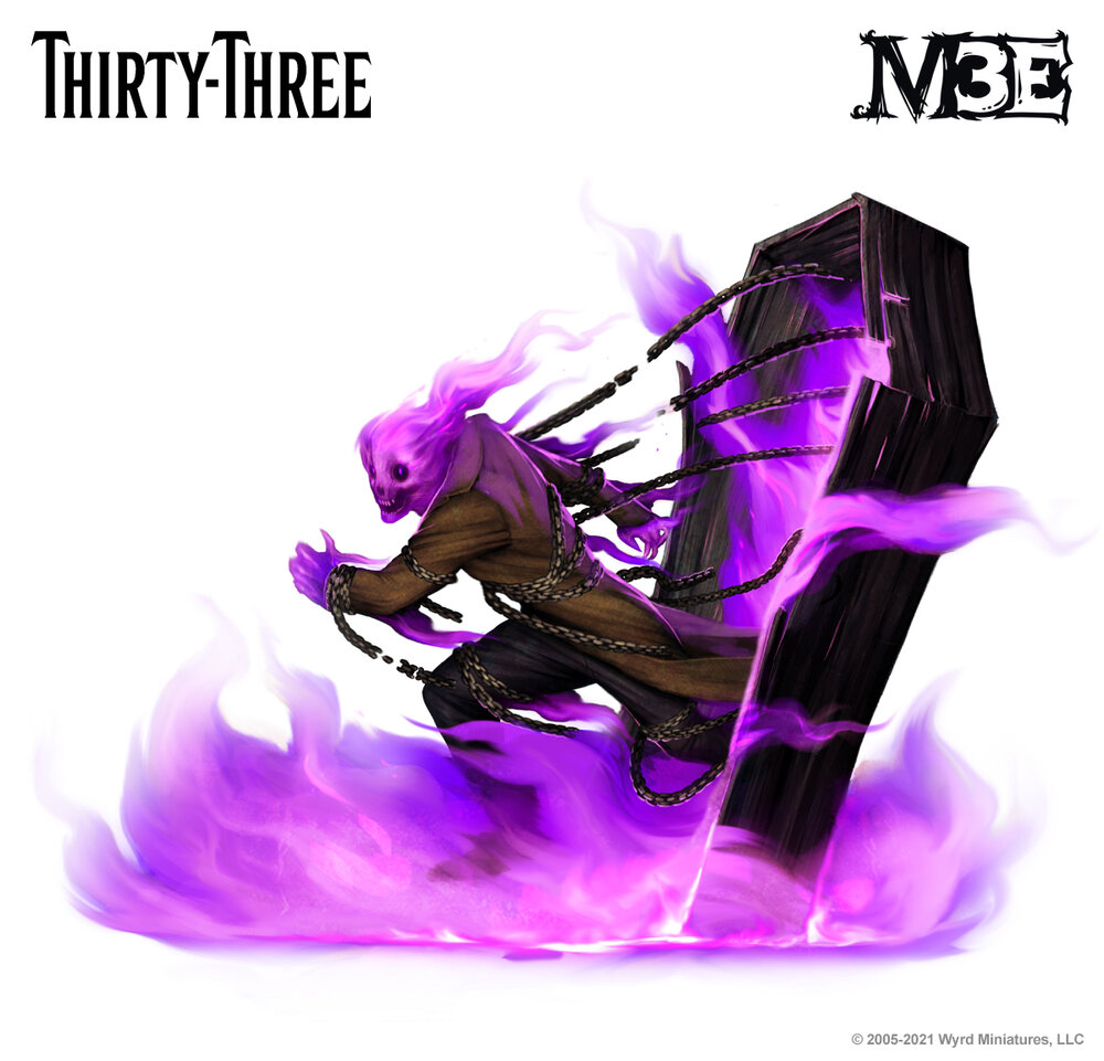 Coming out of her box and she's been doing just fine. Credit: Wyrd GamesThirty-Three was one of the first Death Marshals. Nobody knows what came between her and Lady Justice, but the Lady stuffed her into her own coffin and left her to rot. Justice decided to retrieve her own coffin, but stopped along the way to check in on her oldest prisoner. Her time in the Void had altered Thirty-Three beyond recognition, but the two women came to an accord, and she's free once more. Tara, too, makes use of her; she has an innate connection to anyone who's been in the Void that long.