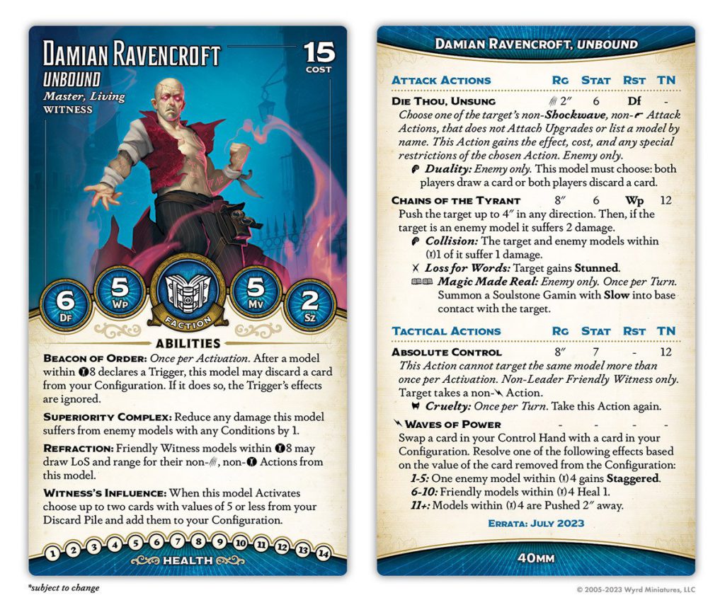 Overall, while it's too early to really rate Damian Unbound, he's unquestionably a lot weaker than his former incarnation, especially with the other nerfs to the keyword. Still, it's not all doom and gloom for Witness players. Damian Ravencroft, Aspirant was nearly as good as his title - absolutely still a broken master - and his card didn't change at all (though the Configuration changes, and the change to Lohith, will both serve to tune him down). I personally think he may be in line for adjustments even after this, since Maintain Order is a really, really gruesome ability to not have a range limit. Marco Bonatti and Miya Murakami are likewise A+ models that didn't get touched aside from the general Configuration change, which does hurt them both but probably not fatally.