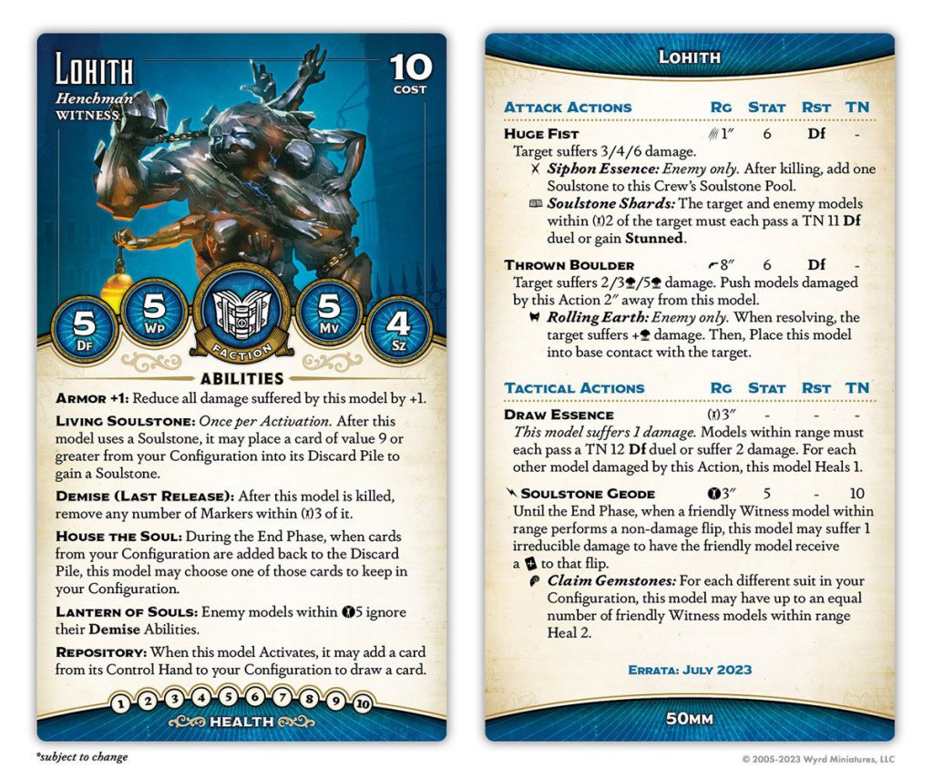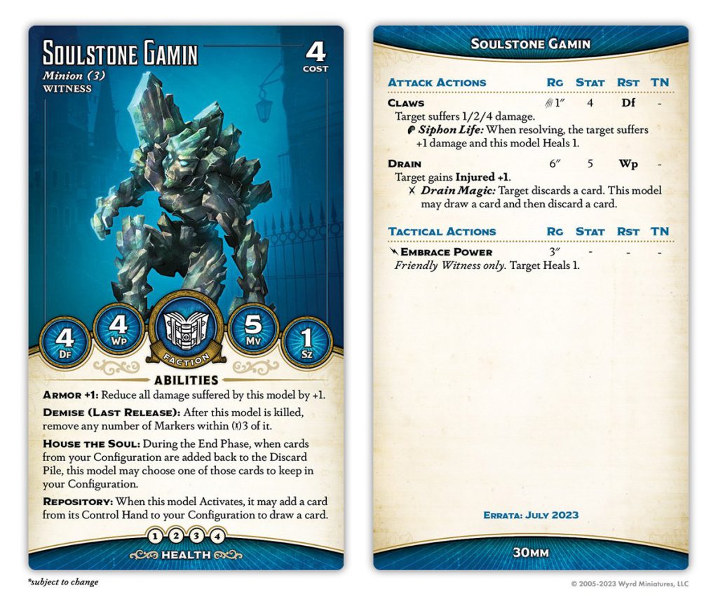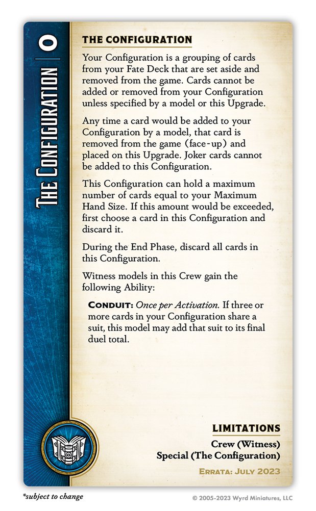 Credit: Wyrd GamesI'm not sure if anyone expected a change to the Configuration itself, but here it is. The change is subtle but tremendous: the Conduit ability, which grants Witness models free suits, is now Once per Activation. This is enormous; the most broken play patterns were those enabled by unlimited free suits, such as Bonatti drawing three cards from Prioritize, Miya drawing three cards from Surge, Soulstone Gamin drawing two cards with Prioritize, Aspirant looting three cards with Drain Magic... ok, it was mostly just insane amounts of card draw, but generally, unlimited free suits with no real downside is, uh, bad. This will make it much harder to abuse the Configuration, and also removes the possibility of benefiting from two different free suits, which several Witness models took greedy advantage of.