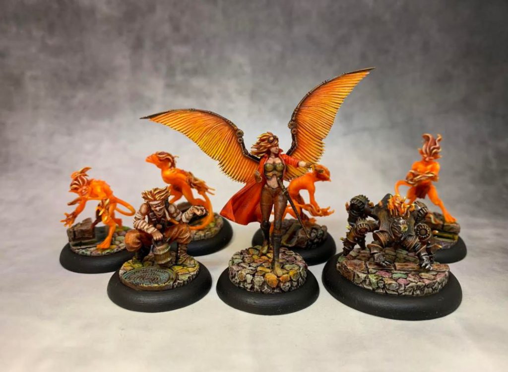 On the table, Kaeris is, unsurprisingly, a master of pyromancy. The Wildfire keyword likes to spread it around, both setting enemies on fire directly and dropping Pyre Markers onto the table that roast anyone who comes into contact with them. Fire isn't picky, though, and while the primary goal of a Wildfire crew is to drop it onto enemies' heads, many of them don't mind being on fire themselves; they can cash it in for various effects, from preventing damage to healing. And of course the Fire Gamin and Golems, elemental creations of pure fire, don't mind it at all. Kaeris herself is fast and mobile with her mechanical wings, and capable of tossing flames all over the place... or simply picking up a troublesome enemy, flying into the sky, and letting them drop. Her title form spreads the gift to friends as well, letting them beseech the Burning Man for aid.