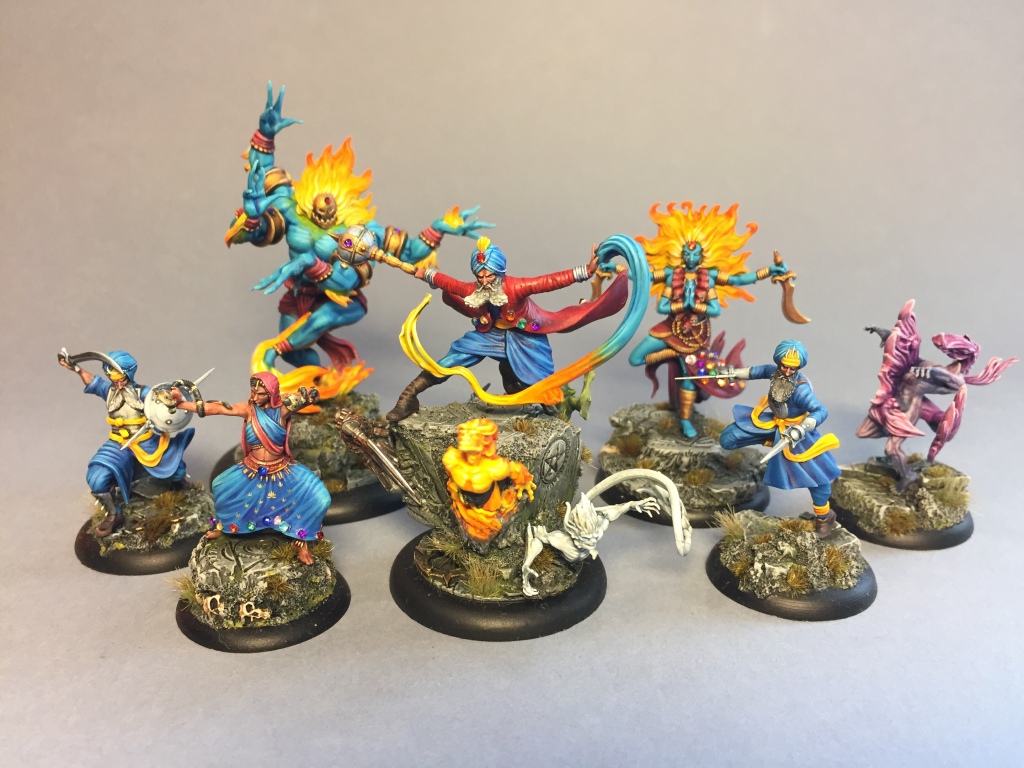 Sandeep, Banasuva, Kandara, two Shastar Vidiya Guards, Kudra, and the Essence of Power. Credit: Jean Peinture (Jein_peinture on Instagram, planningcharge on Facebook)Poor Sandeep Desai. All he ever wanted was to study. Raised in a temple in his native India, Sandeep studied the arcane from a young age, mastering elemental magic and summoning elemental spirits (or Gamin) to do his will. Unfortunately, the Guild would not leave him in peace. Sandeep's teacher was executed by local Guild officials for speaking out against Guild tyranny, and in a blind fury, Sandeep took up his master's cursed gada. Letting out his repressed rage, he unleashed Banasuva, the elemental spirit bound within the gada. The two of them took their revenge, but Sandeep realized he had burned his bridges and become a wanted criminal. He fled to Malifaux, partially to escape Guild justice, but partially to gain control of his rage and his elemental powers. Banasuva, imprisoned in the gada long ago by a nameless hero, is a fiery and destructive presence, and Sandeep is forever trying to repent for having set him free.
